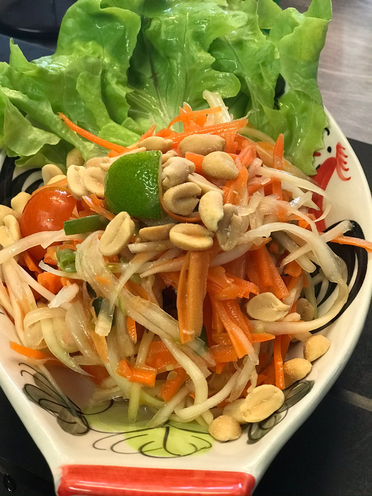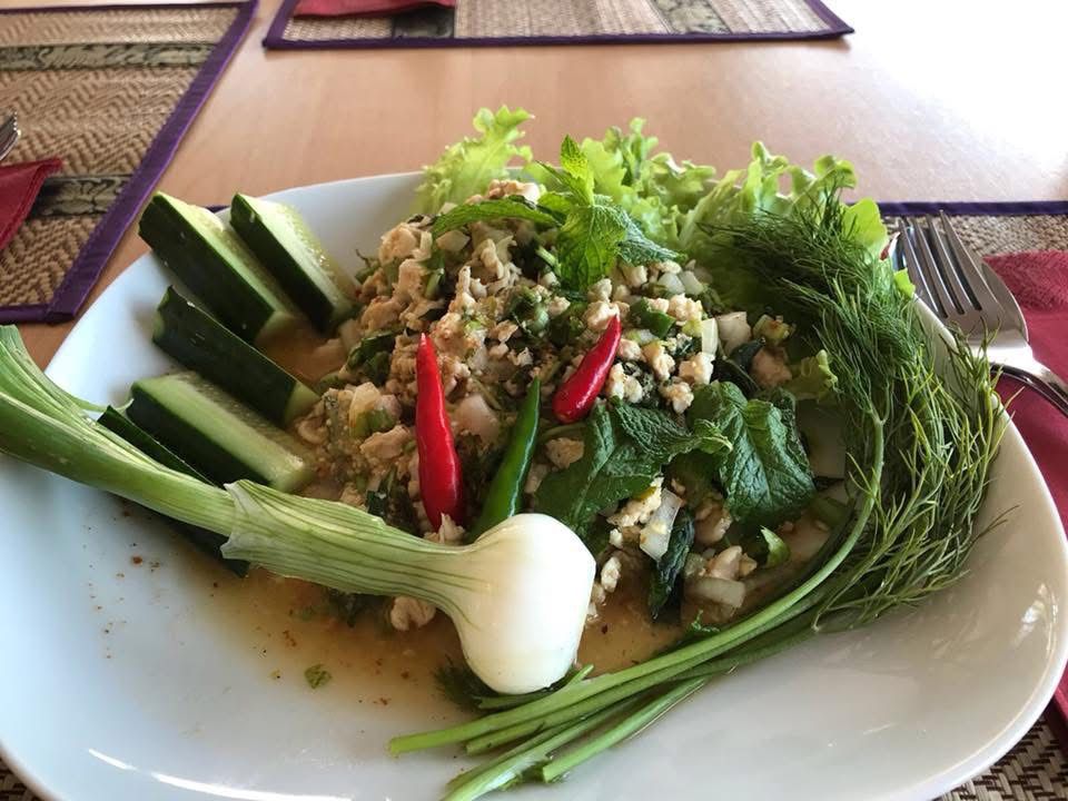 Poulet-Hackfleischsalat mit Chilipulver, geröstetem Reis, Schalotten, Minzblätter und Koriander verfeinert im Chili-Limetten Dressing und Fischsauce