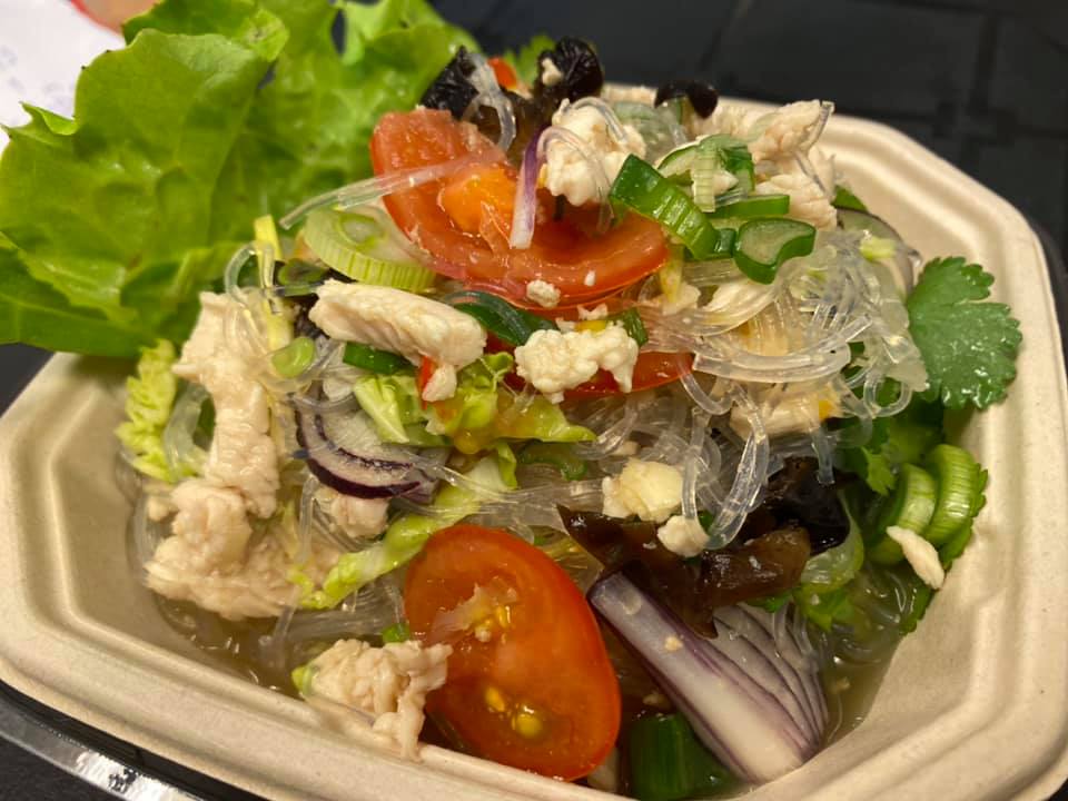 Glasnudeln mit Poulet-Hackfleischsalat im Chili-Limetten Dressing, serviert mit Koriander und Cashew-Nüsse
