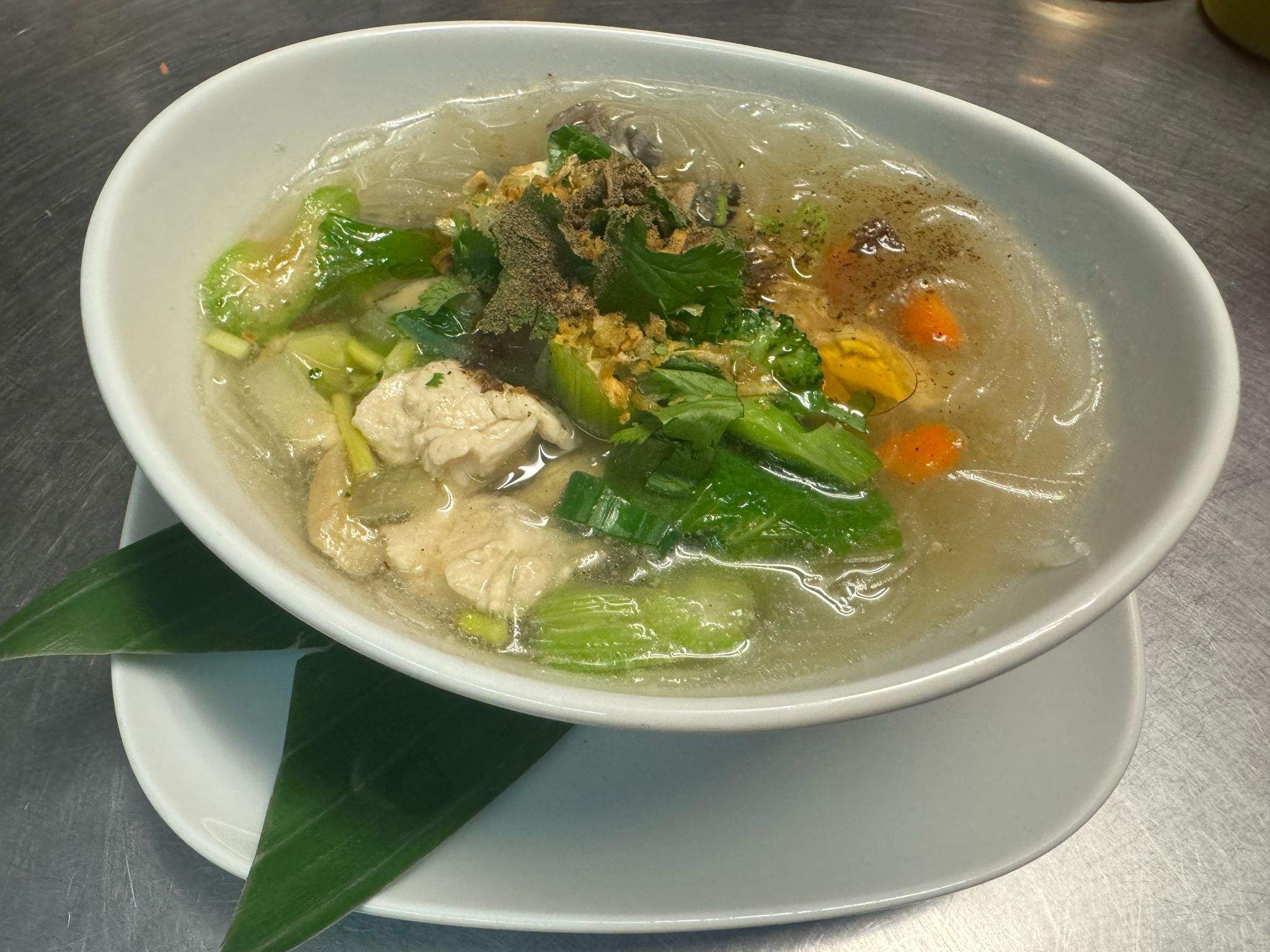 Glasnudeln in einer Fleischbouillon-Suppe mit Saison-Gemüse und Mu-Err-Pilze, verfeinert mit Tofu und Koriander, garniert mit geröstetem Knoblauch