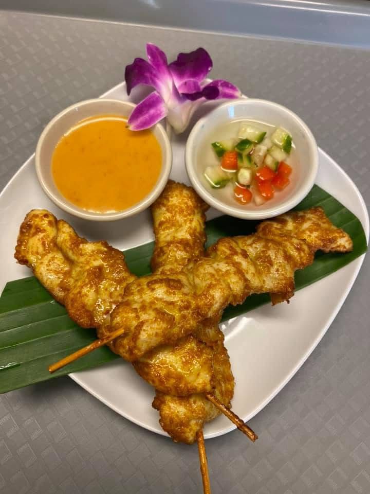 3 Pouletspiesse frittiert, serviert mit Erdnuss Sauce und Pikantem Gurkendressing